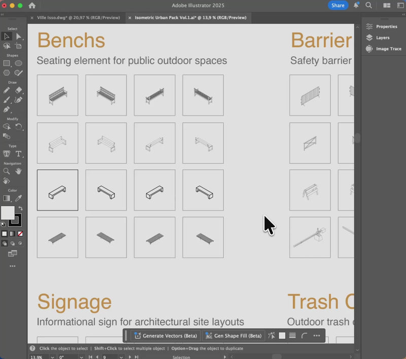 Cut post-production in half. Boost presentation quality. This pack includes 100 high-quality vector elements for urban zone, provided in PNG, DWG and Illustrator formats, that architects actually use.